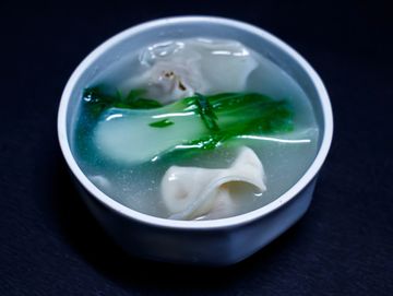 Prepared with vegetable wonton and fresh bok choy.