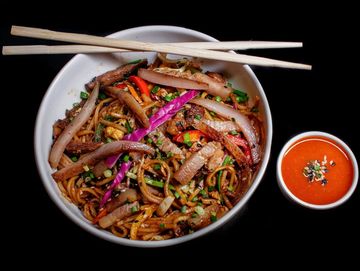 With fresh veggies, garlic, ginger, and green chili with chicken pieces in a rich, savory broth. Topped with crispy fried noodles for the perfect crunch. Warm, spic, and irresistibly delicious.