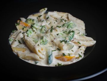 Penne alfredo pasta is a creamy, comforting delicacy made with penne tossed in a rich, buttery sauce of Parmesan cheese, cream, and garlic. The taste is smooth, cheesy, and mildly savory, with a hint of nutty depth from the Parmesan. Each bite is velvety and satisfying, making it a classic, indulgent favorite.