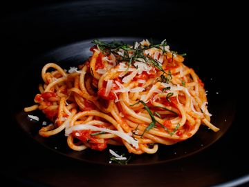 Spaghetti arrabiata is a perfect mix of heat and taste. Al dente spaghetti drenched in a rich, spicy tomato sauce, infused with garlic, extra virgin olive oil, and red chili flakes for the perfect kick. Topped with fresh basil and Parmesan, every bite is a burst of flavor. Pair it with garlic bread and dive into this irresistible Italian classic. Spicy, saucy, and simply delicious, try it today.