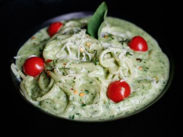 Spaghetti with pesto sauce is a fresh and aromatic dish made with al dente pasta tossed in a vibrant green basil pesto. The sauce blends fresh basil, garlic, pine nuts, parmesan cheese, and olive oil, creating a rich, nutty, and herbaceous flavor, and it is Light yet flavorful.