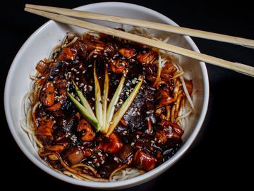 Jajangmyeon is a beloved Korean noodle dish known for its rich, savory black bean sauce made with chunjang, stir-fried chicken, and diced vegetables. The sauce is deeply flavorful, earthy, slightly sweet, and full of umami. It is topped with julienned cucumber or a boiled egg, and it offers a comforting, hearty meal with bold, satisfying taste.