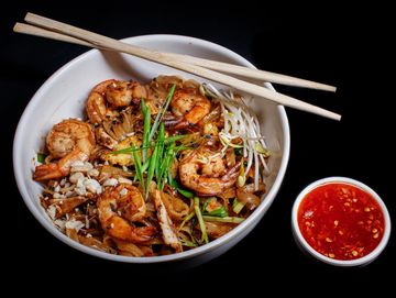 Pad Thai is a classic Thai stir-fried noodle dish that combines tender rice noodles with succulent shrimp or chicken, scrambled eggs, and crunchy crushed peanuts. The noodles are cooked in a flavorful sauce made from tangy tamarind paste, salty fish sauce, sweet palm sugar, and a hint of lime juice, creating a perfect balance of sweet, sour and savory flavors. Finished with fresh bean sprouts, chopped green onion and fragrant cilantro, Pad Thai offers a delightful mix of textures and vibrant.