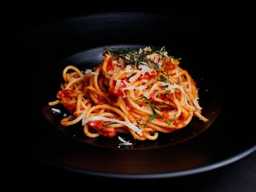 Spaghetti Arrabiata is a perfect mix of heat and taste. Al dente spaghetti drenched in a rich, spicy tomato sauce, infused with garlic, extra virgin olive oil, and red chili flakes for the perfect kick. Topped with fresh basil and Parmesan, every bite is a burst of flavor. Pair it with garlic bread and dive into this irresistible Italian classic. Spicy, saucy, and simply delicious, try it today.