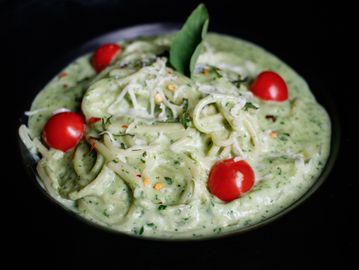 Spaghetti with pesto sauce is a fresh and aromatic dish made with al dente pasta tossed in a vibrant green basil pesto. The sauce blends fresh basil, garlic, pine nuts, parmesan chees, and olive oil, creating a rich, nutty, ty and herbaceous flavor, and it is Light yet flavorful.