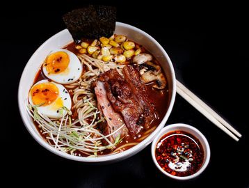 Warm your soul with our miso ramen. A deeply savory broth, infused with rich miso paste, creates a truly comforting experience. We combine this with thick, chewy noodles and a medley of delicious toppings, including tender chashu pork or chicken, sweet corn, and vibrant