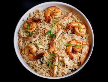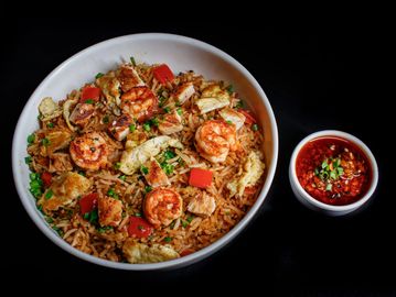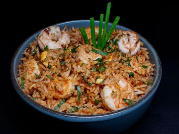Thai fried rice is a savory and aromatic dish made by wok tossing fragrant jasmine rice with eggs, onion, chicken, and prawns. It's seasoned with a flavorful blend of fish sauce, soy sauce, and a squeeze of lime, creating a delicious harmony of salty, tangy, and slightly sweet notes. Often served with fresh cucumber slices, lime wedges, and a sprinkle of herbs, this dish is comforting, satisfying, and full of authentic Thai flair.