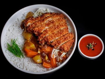 Katsu curry rice is a Japanese classic featuring crispy, golden chicken or pork cutlets atop fluffy rice, drenched in rich, velvety curry. The curry is mildly spiced and slightly sweet, simmered with tender carrot, potato, and onions for deep, comforting flavor. Each bite delivers you the perfect balance of crunch, warmth, and savory goodness.